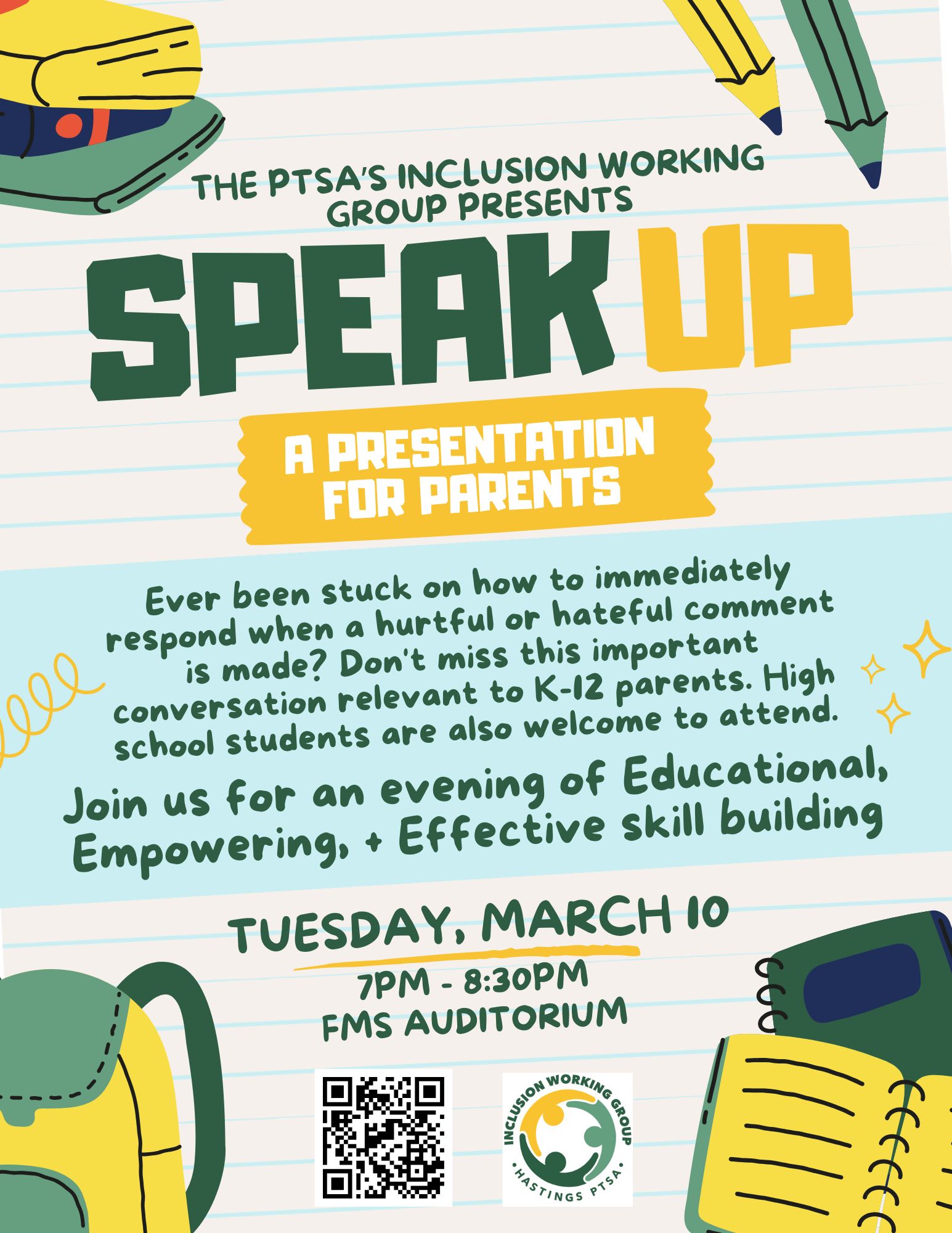 Witness tomorrow night’s Speak Up Presentation, sponsored by the PTSA’s Inclusion Working Group, Hastings students, staff, parents and families are dedicated to confronting hurtful and hateful language and actions. Tomorrow night’s forum is open to the public (7:00 p.m. in the FMS Auditorium).